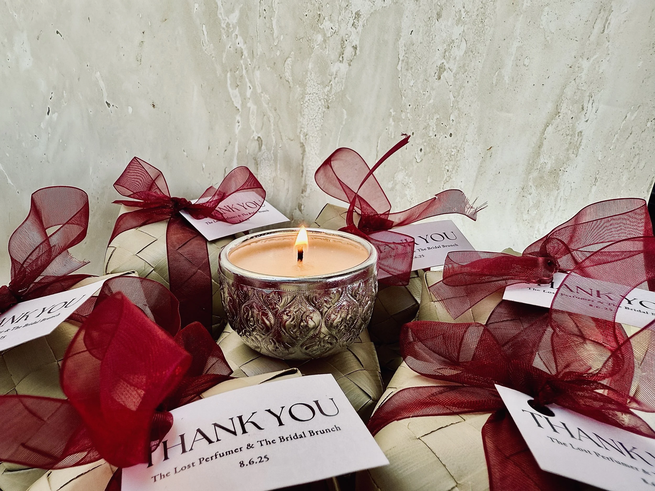 Each candle is poured into a beautiful silver toned vessel and finished with a personalised tag, making it a thoughtful and elegant gift for weddings, bridal showers, or engagement celebrations. Whether placed at each setting or included in welcome bags, these candles are more than just favours – they’re a sensory memory of your special day.
